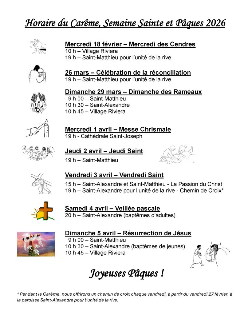 CONVOCATION – La présentation annuelle aux paroissiens des états financiers 2025, du budget 2026 ainsi que les faits saillants marquants de 2025 aura lieu les 14 et 15 février aux début de chacune des célébrations eucharistiques.